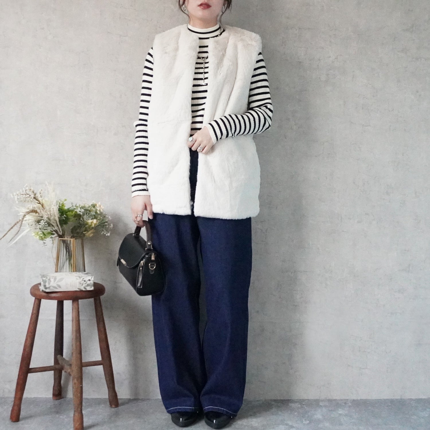 季節感たっぷりのふんわりファーで、コーデをワンランクアップ。